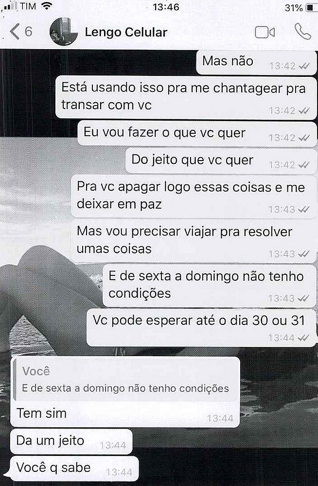 As ameaças duraram uma semana. As mensagens chegavam ao celular da recepcionista várias vezes durante o dia. Em algumas delas, a vítima pedia para Fernando Alves parar, que ele estava fazendo chantagem – o empresário, no entanto, insistia em fazer sexo com a vítima, inclusive dava detalhes o que pretendia fazer com ela num motel. “Ela já estava mais que desesperada. Minha cliente tem uma filha de 15 anos. Ele disse que além de disseminar as fotos e conversas para grupos de WhatsApp, inclusive da família, ia mandar o conteúdo para a filha dela”, disse o advogado.