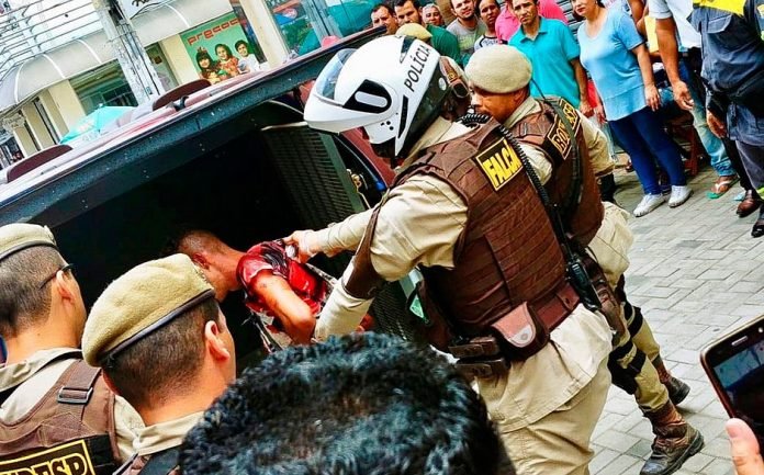 Um homem de 30 anos foi baleado na manhã desta quinta-feira (24), em Vitória da Conquista, Sudoeste da Bahia, após tomar a arma de um segurança de uma agência bancária e realizar disparos no centro da cidade.