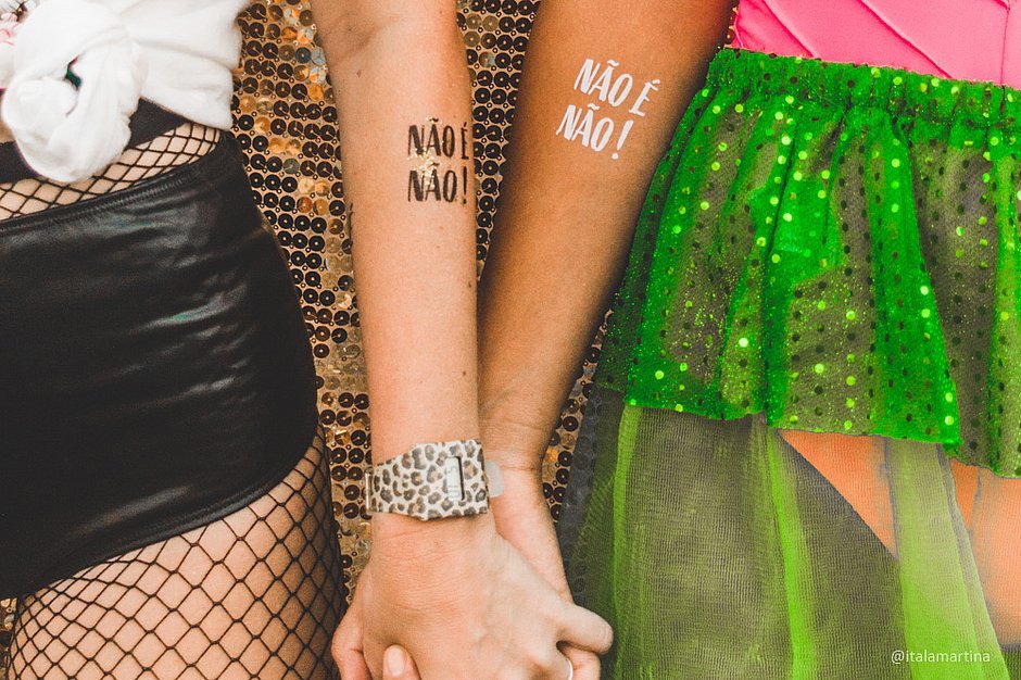 Uma das fundadoras foi vítima de assédio justamente em um samba no pré-Carnaval. Ao conversar com um grupo de amigas, todas perceberam o quanto aquilo era comum – e, mais do que isso, normatizado. Daí veio a ideia de colocar um aviso – de que a recusa não significa ‘talvez’ – no próprio corpo, onde as mulheres são mais invadidas, sob a forma de tatuagens.
