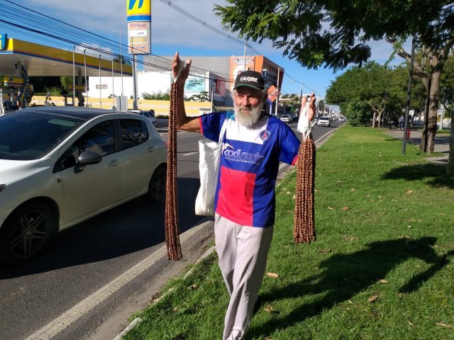 “Saio todos os dias por volta das 9h da manhã e fico em vários pontos da cidade. Perto Amélio Amorim, na Getúlio Vargas e no contorno da Santa Mônica. Antes eu vendia a noite, mas ficou perigoso e eu deixei. Antes eu tinha medo de faltar leite para as crianças, mas depois que eles cresceram e começaram a trabalhar também eu deixei. Antes minha renda familiar era toda do licuri e agora que minha esposa se aposentou ela me dá uma força. Graças a Deus foi com o licuri que eu consegui organizar minha vida. Meus filhos acham que eu sou insistente em continuar vendendo, mas eu não viso muito dinheiro, viso um trabalho que seja admirado por outras pessoas, que precisa ser representado. O rosário do coquinho é uma tradição de muitos anos e ninguém quer mais fazer porque é trabalhoso. Mas, eu continuo. Não tem concorrência. A única coisa que me assusta é ter inimigos. Não quero ser inimigo de ninguém. A inimizade gera ambição e para mim isso não existe”, comentou.