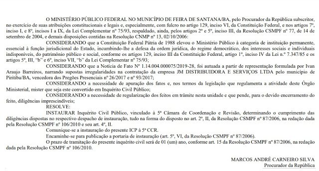 Encontra-se na 5ª Câmara, no setor de Combate à Corrupção, a denúncia de nº 1.14.004.000075/2019-28, apresentada pelo vereador Ivan Araújo Barreiros (PSDB), de Piritiba -BA. No dia 1° de abril último, através da Portaria nº 8, o Procurador da República Marcos André Carneiro Silva decidiu instaurar Inquérito Civil Público, vinculado à 5ª Câmara de Coordenação e Revisão, determinando o cumprimento de diligências dispostas no respectivo despacho de instauração.
