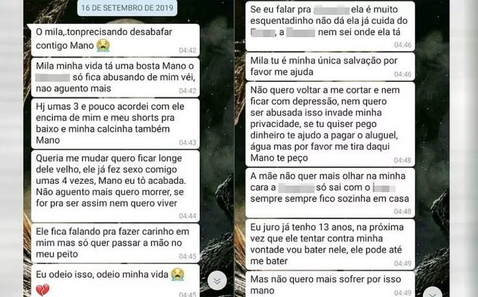 O crime foi em setembro, segundo a irmã, que resolveu denunciar agora porque o pai continua solto. Há várias mensagens da garota relatando os abusos. “Não aguento mais, quero morrer. Ele diz que só quer fazer carinho em mim, mas só quer passar a mão no meu peito”, diz um dos trechos.