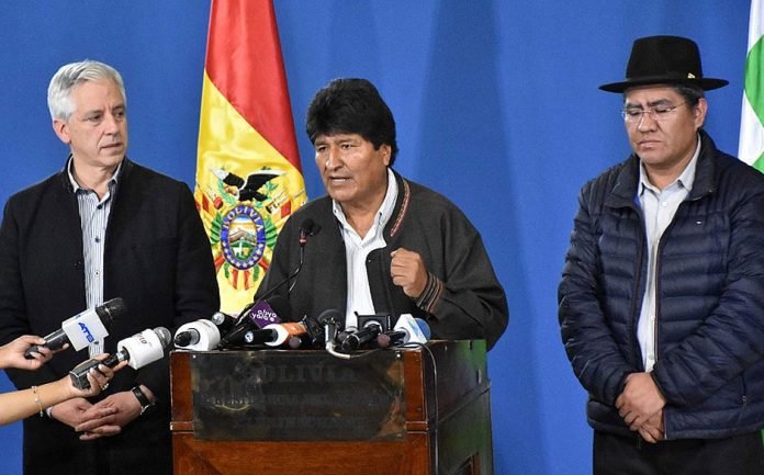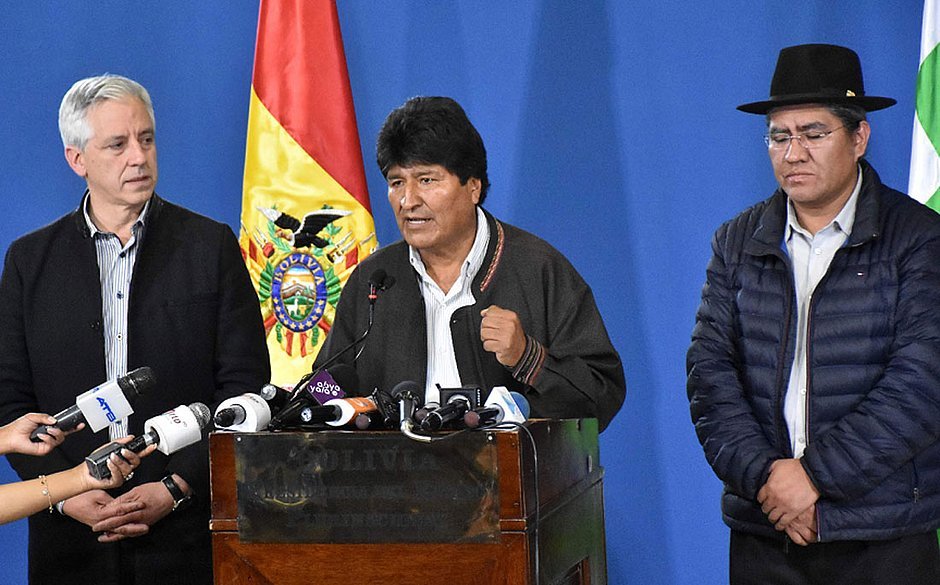 A eleição de 20 de outubro terminou com reeleição no primeiro turno de Morales. Segundo o órgão eleitoral do país, Evo teve 47,07% dos votos, contra 36,51% de Carlos Mesa. Como a diferença entre Morales e Mesa foi de mais de 10 pontos percentuais, o atual presidente foi reeleito para seu quarto mandato. A oposição contestou o resultado e em 30 de outubro a Bolívia fez acordo com a OEA para que uma auditoria fosse feita.