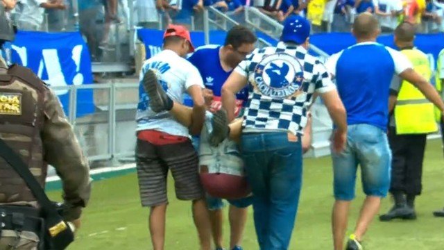 Os minutos finais no Mineirão não foram apenas tensos. Foram de vandalismo, confusão. Torcedores revoltados começaram a quebrar cadeiras. Houve corre-corre, tentativa de invasão de campo. O jogo foi paralisado aos 40 minutos da etapa final. O ambiente ficou pesado. Bombas foram jogadas nas arquibancadas. Um torcedor saiu carregado, aparentemente machucado. Outro foi atendido na arquibancada. Houve invasões em alguns setores. A Polícia Militar precisou intervir. Sem condições de segurança, o árbitro Marcelo de Lima Henrique encerrou a partida. A administração do Mineirão publicou mensagens no telão solicitando para que os torcedores evacuassem o estádio.