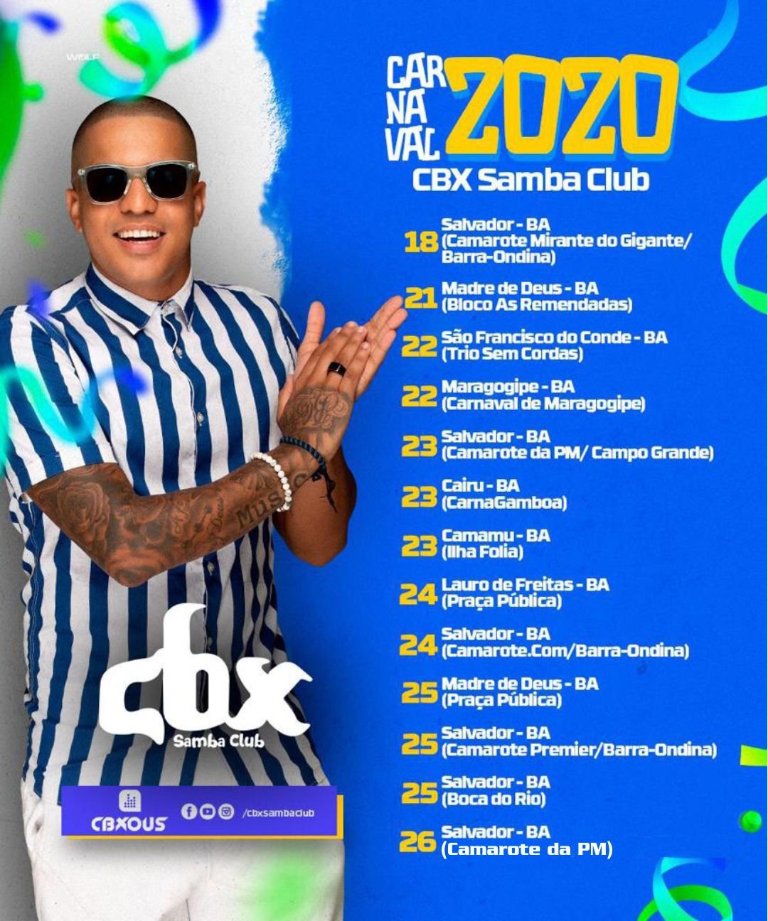 EntretenimentoEventosNotícias do Estado Nova Revelação do Samba da Bahia, Banda CBX Samba Club divulga sua agenda de Carnaval. By Portal do Recôncavo - 12 de fevereiro de 2020 0 229 Compartilhar no Facebook Tweet on Twitter A queridinha dos soteropolitanos, a banda CBX Samba Club divulga sua agenda de shows para o carnaval 2020. Serão 13 shows em 6 cidades diferentes.