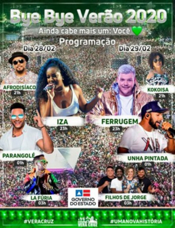 Para o prefeito Marcus Vinicius, realizar a quarta edição do festival comprova que o evento já se tornou agenda obrigatória no calendário cultural do estado. “Antes do Bye Bye Verão, os visitantes iam embora da cidade logo após o carnaval e, após a criação dele, eles esticam um pouco mais a estadia e ficam mais uma semana em Vera Cruz, o que gera um aumento na movimentação econômica da cidade”. No ano passado, o Bye Bye Verão movimentou cerca de R$3 milhões, apenas durante o período da festa. Com expectativa de público de 100 mil pessoas o Bye Bye Verão 2020 vai fazer circular na cidade em média 7,5 milhões de reais entre os setores de hospedagem, transporte, alimentação, vestuário, compras e lazer. Um evento gratuito, num local belíssimo, com excelentes atrações, e que só cabe mais um: Você.