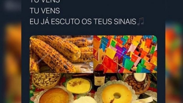 Já a página Comédia Baiana compartilhou uma foto com diversas comidas típicas juninas: “Tu vens, tu vens. Eu Já escuto os teu sinais”, diz o meme.