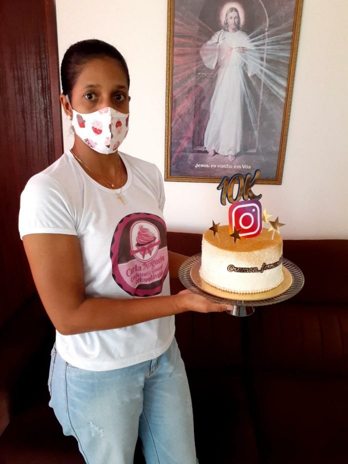 Com apenas 36 anos, Carla Nogueira iniciou na profissão de doceira em 2015, mas foi morando em Santa Bárbara, na Bahia, que seu negócio se firmou, hoje ela produz os produtos da confeitaria em um espaço da sua casa.