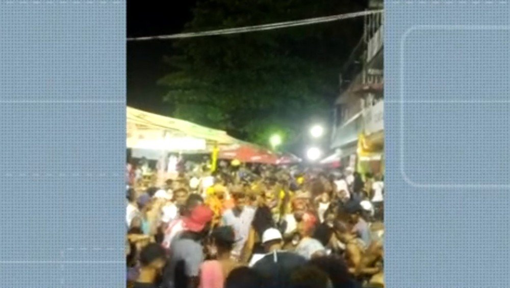 A multidão estava aglomerada, a maioria sem máscara. No local, som alto e consumo de bebidas alcoólicas.