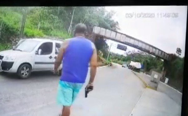 Câmeras de segurança flagraram duas das situações. Na primeira, um homem chegou em um carro do tipo minivan, desceu do veículo e sacou uma arma para o guarda que tinha pedido a identificação dele. O homem discutiu com o guarda e voltou para o carro.