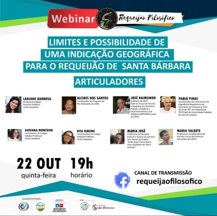 A Webinar terá a participação do professor ALCIDES DOS SANTOS (Coordenador do Programa de Pós Graduação da UFBA), do professor JOSÉ RAIMUNDO (Líder do Grupo de Estudos e Pesquisas em Economia Popular e Solidária e Desenvolvimento Local Solidário (GEPOSDEL) junto ao CNPq, do Professor PABLO PIRAS (Coordenador dos laboratórios de Engenharia Bioquímica e de Simulação de Processos e Tutor do Grupo PET em Engenharias (PET.Engs) da Universidade Estadual de Feira de Santana e da Equipe Colégio Estadual Professor Carlos Valadares.