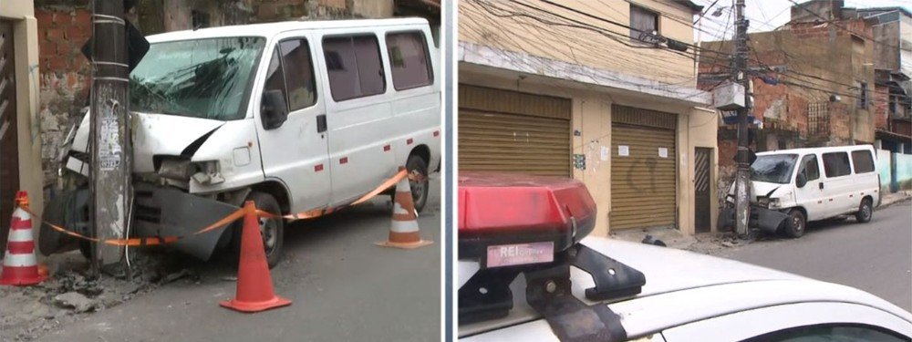 O poste está sustentado pela própria van. Equipes da Companhia de Eletricidade do Estado da Bahia (Coelba) estão no local, para fazer a sustentar o poste, permitindo a retirada do veículo.