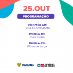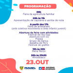 O primeiro dia de atividade começa com uma feira de agricultura Familiar. Na sequência, a programação conta com apresentação de capoeira e samba de roda, Feira de artesanato – Arte coletiva movimento e área infanto juvenil e um Festival de Hip Hop que contará com DJ, poesia, grupo de dança, batalha de Mc´S, apresentações musicais e festival de grafite. O dia termina com pocket show de Clara Cintra e apresentação do Afrodisíaco.
