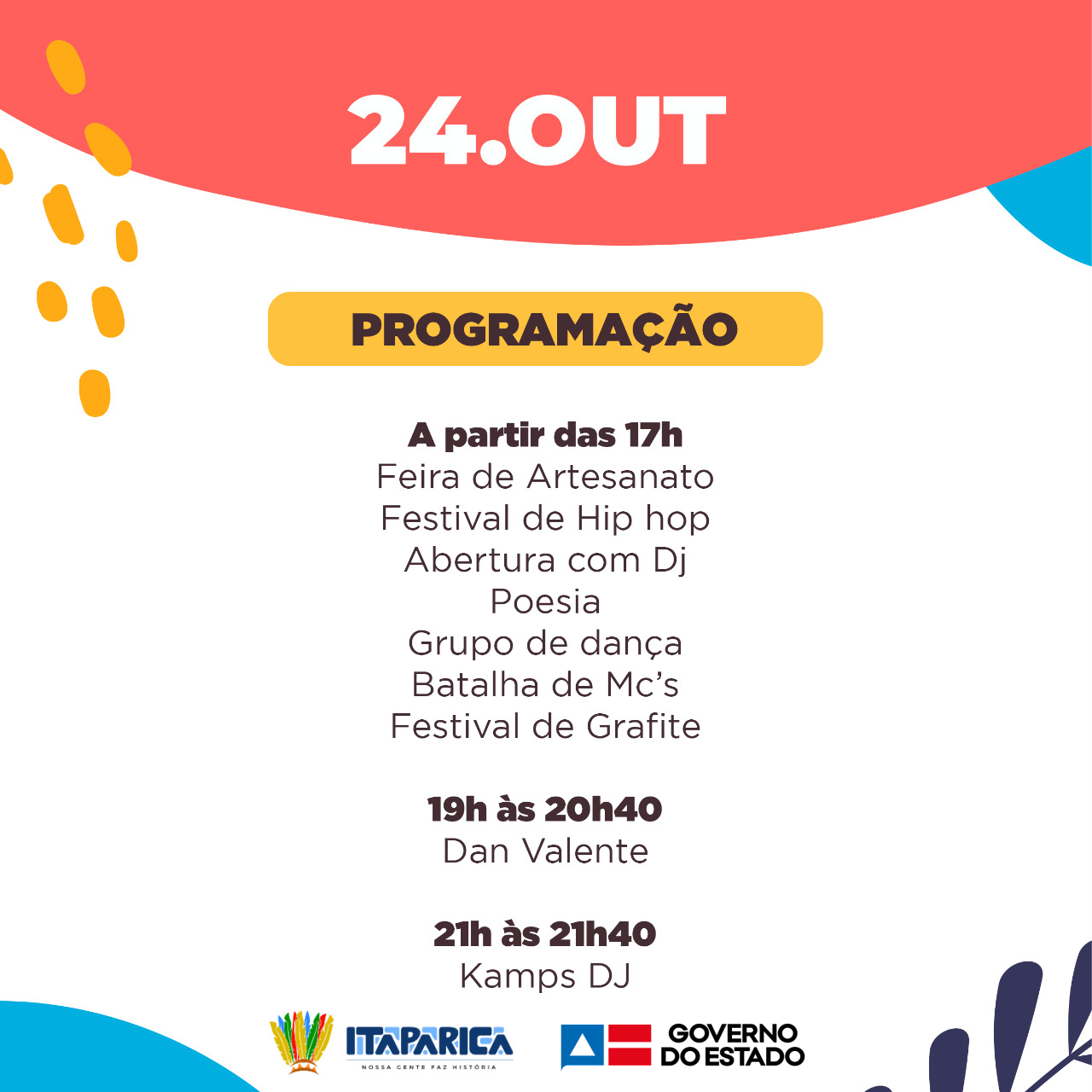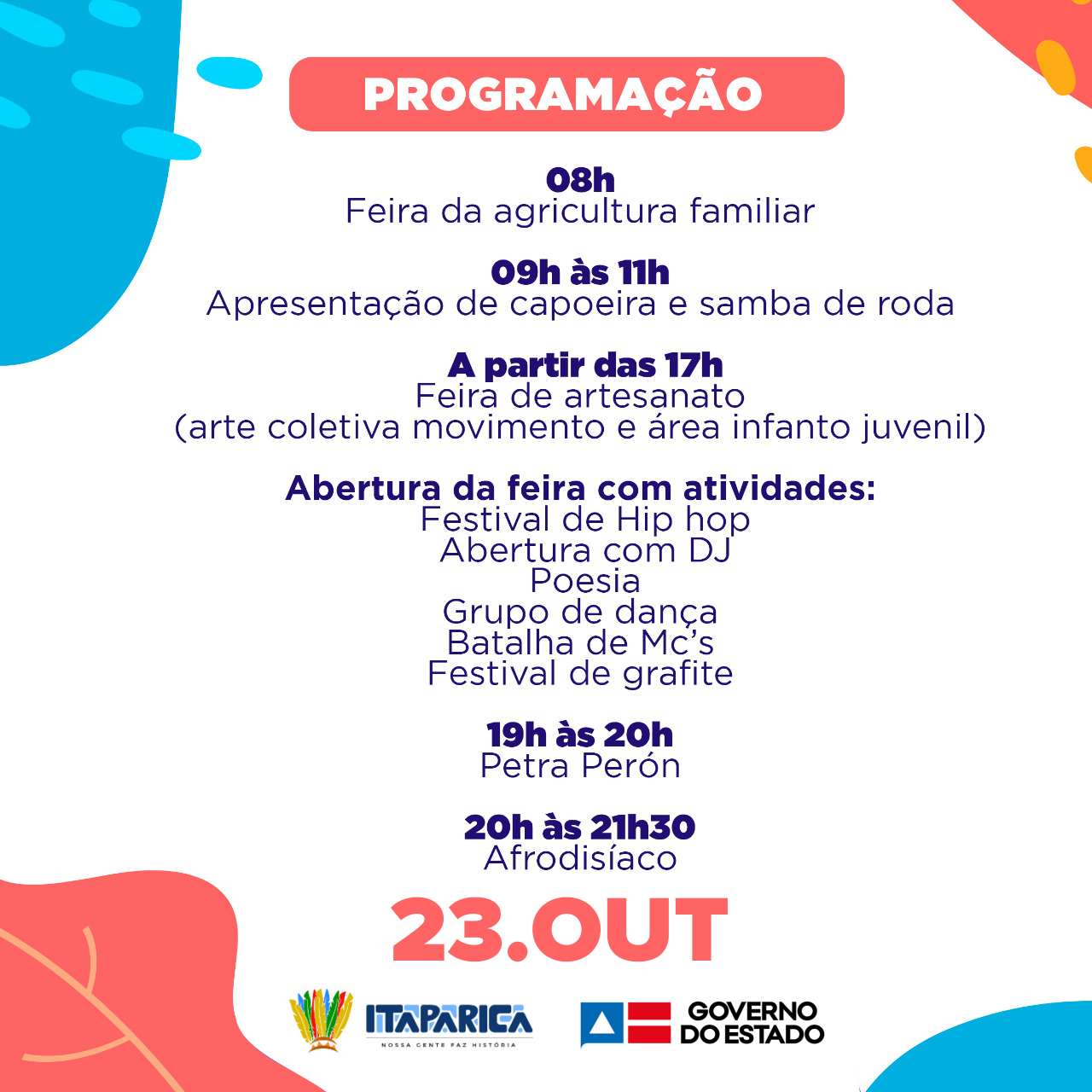 Em comemoração aos 190 anos de emancipação, a prefeitura de Itaparica realiza uma série de inaugurações que culminará em uma grande feira intitulada ARTE E SABOR que ocorrerá no largo tradicional da praça da kitanda com atividades artísticas e culturais seguindo os protocolos sanitários. Deste sábado, dia 23, até segunda-feira, dia 25, atividades artísticas e culturais animam o público local.