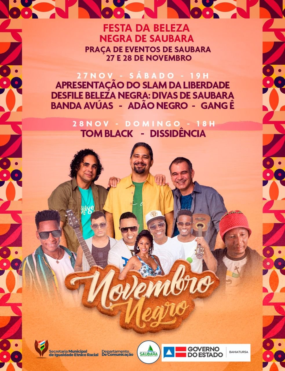 A prefeitura municipal de Saubara vai realizar nos dias 27 e 28 de novembro, o dia da Beleza Negra 2021. O evento contará com desfile e concurso da beleza negra, além de shows das bandas Adão Negro, Gang Ê, Tom Black e diversos artistas locais.