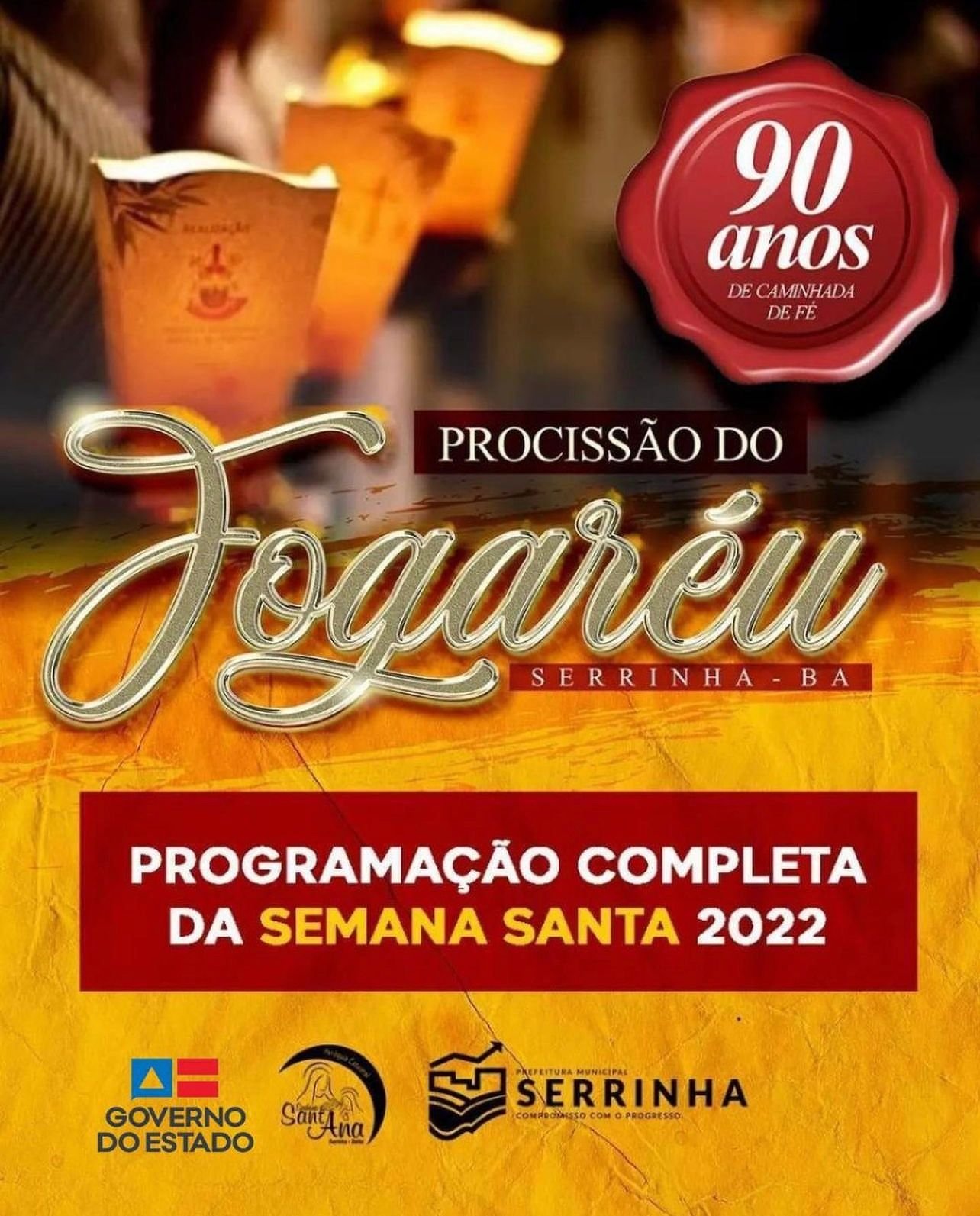 Notícias do Estado 90 anos da Procissão do Fogaréu em Serrinha By Portal do Recôncavo - 6 de abril de 2022 0 141 Compartilhar no Facebook Tweet on Twitter PROCISSÃO DO FOGARÉU EM SERRINHA, BAHIA, COMPLETA 90 ANOS DE CAMINHADA DE FÉ. PROGRAMAÇÃO COMPLETA DA SEMANA SANTA DE 15 a 17 DE 2022. CONFIRA A PROGRAMAÇÃO: O EVENTO TEVE O APOIO GOVERNO DO ESTADO DA BAHIA!