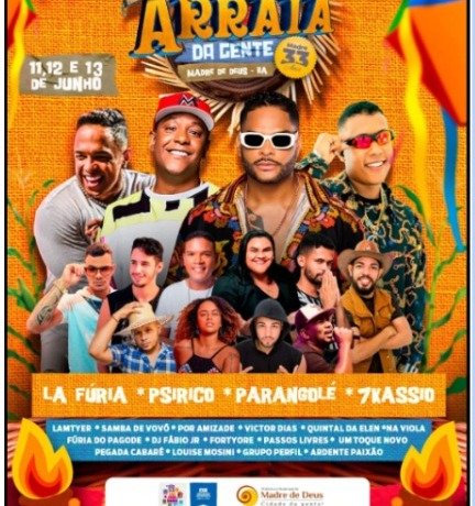 O Arraiá da gente, festa que comemora o aniversário de 33 anos de Madre de Deus, tiveram Os nomes dos artistas foram divulgados pela prefeitura. Bandas tradicionais da região dentre outras.