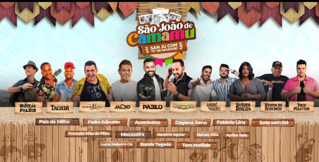 A prefeitura de Camamu divulgou a programação musical completa do São João 2022. Serão sete dias de festa, de 21 a 27 de junho