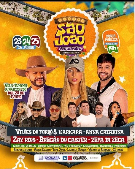 A prefeitura de Itaquara divulgou em suas redes sociais as atrações escolhidas para animar os festejos juninos da cidade. Serão seis dias de festas no mês de junho entre Pré São João e a festa principal com as seguintes atrações: