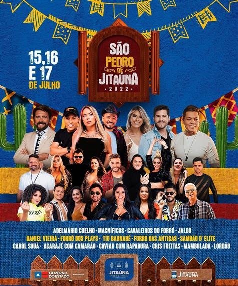O tão aguardado São Pedro de Jitauna ja tem data e atrações. O evento acontecerá nos dias 15 a 17 de julho, e as atrações foram divulgadas hoje. No primeiro dia de festa (15) terá os shows de Forrozão G7, Danniel Vieira e Carol Souá. No segundo dia de festa (16) terá os shows de Caviar com Rapadura, Magnificos e Forró das antigas. E no ultimo dia (17) terá os shows de Adelmário Coelho, Mambolada, Cavaleiros do Forró e Wallas Arrais.
