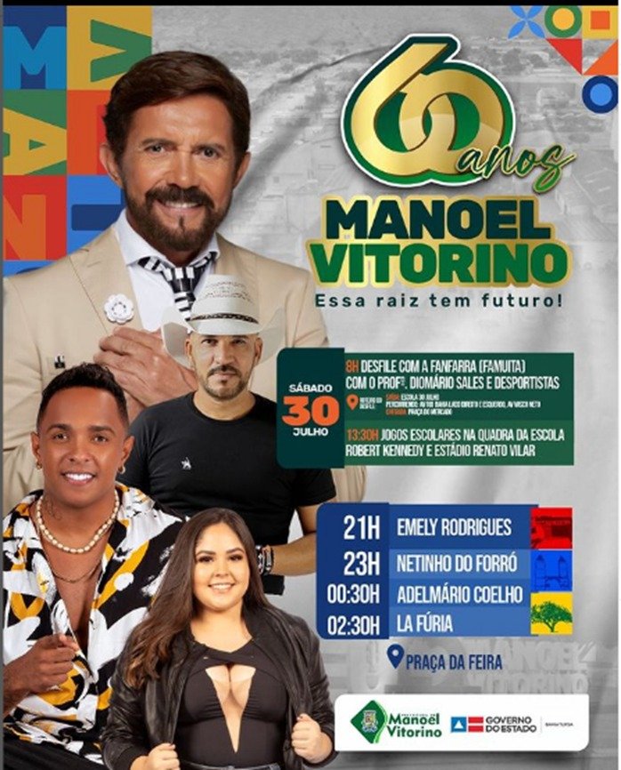 Para comemorar os 60 anos de emancipação política no próximo dia 30/07, a prefeitura da cidade baiana de Manoel Vitorino confirmou a realização de um evento festivo. Além da festa cívica, estão marcados shows de Adelmário Coelho, Lá Furia, Emelly Rodrigues e Netinho do Forró.