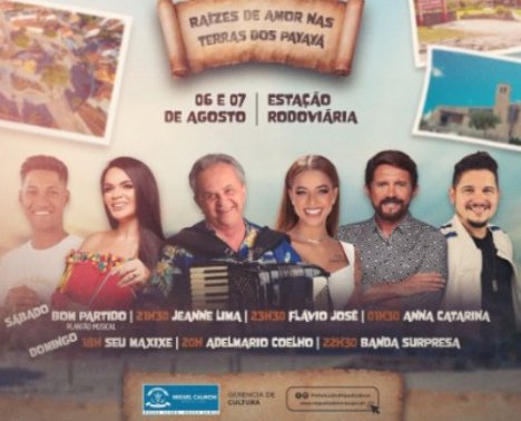 Com o tema: Raízes de Amor nas Terras de Canabrava, os festejos comemorativos contarão com as apresentações dos artistas 06/08 Flávio José, banda Bom Partido, Jeanne Lima, Anna Catarina