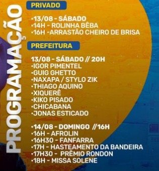 Já no dia 14 acontecerão apresentações de fanfarras e bandas locais.