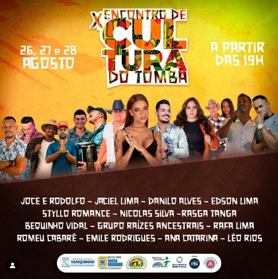 A Prefeitura de Santa Bárbara confirmou a reazliação do 10º Encontro Cultural do Tomba em parceria com a Associação Comunitária Rural do Tomba e Adjacências. A edição de 2022 do Encontro será realizada entre os dias 26 e 28 de Agosto e reunirá grande número de manifestações da cultura local como Roda de Capoeira, Samba de Roda, Bumba Meu Boi e Encaretados. Para o encerramento do Encontro, no dia 28/08 estão programados shows de Emelly Rodrigues, Léo Rios e Anna Catarina, além de atrações locais.