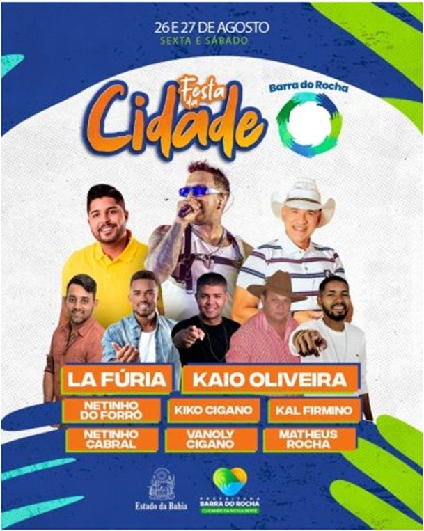 O município de Barra do Rocha fará no último final de semana de agosto a Festa da Cidade, e para completar a vasta programação, a Prefeitura, com o apoio do governo do Estado, estará promovendo dois dias de shows, na sexta-feira (26/08/2022) se apresentam: Vanoly Cigano, Netinho do Forró, Kiko Cigano e La Fúria, no sábado (27/08/2022): Matheus Rocha, Kaio Oliveira, Netinho Cabral e Kal Firmino. Serão dois dias de muita alegria e animação, com total apoio da Polícia Militar.