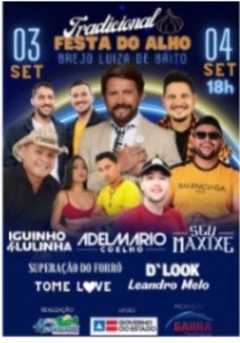 Neste sábado (03,09,22), a Prefeitura de Novo Horizonte, vai realizar o 1º dia da tradicional festa do Alho no Distrito de Brejo de Luíza de Brito ,o primeiro da festa vai ser um sucesso de público, as atrações ficam por conta: