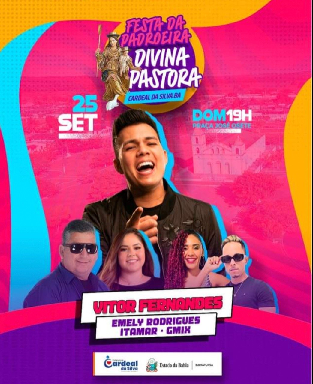 EntretenimentoNotícias do Estado CONFIRMADA A FESTA DA PADROEIRA EM CARDEAL DA SILVA By Portal do Recôncavo - 14 de setembro de 2022 0 159 Compartilhar no Facebook Tweet on Twitter A Festa da nossa Padroeira, Divina Pastora já tem dia, hora e ATRAÇÕES CONFIRMADAS . Acontecerá dia 25 de setembro de 2022, às 19 horas, na Praça José Osete em Cardeal da Silva. Serão as atrações: Vitor Fernandes, Emily Rodrigues, Itamar e Gmix.