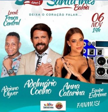 A prefeitura de Santa Inês, irá realizar uma grande festa, que será no domingo, dia 06 de novembro 2022, a partir das 14 horas. Você já pode ir se preparando para deixar o coração falar mais alto e curtir Adelmário Coelho, Anna Catarina, Adriano Olyver, apresentação da FANMUSI, Equipe Extreme (Som e Rebaixados), e muito mais.