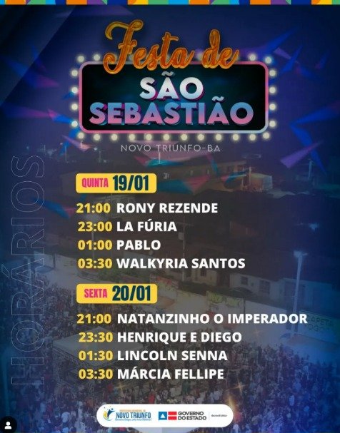 A Prefeitura de Novo Triunfo realiza nos próximos dias, 19 e 20 de janeiro de 2023, na Praça de eventos, a Festa de São Sebastião em comemoração ao dia do santo padroeiro do município, celebrado em 20 de janeiro. A festa contará com várias atrações, o evento será um momento de confraternização familiar para celebrar um dia importante para o município. A Festa de São Sebastião está sendo promovida pela Prefeitura de Novo Triunfo em parceria com o Governo do Estado.
