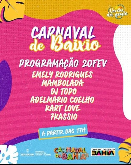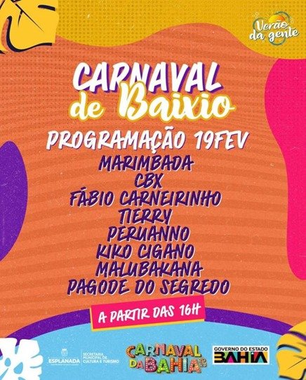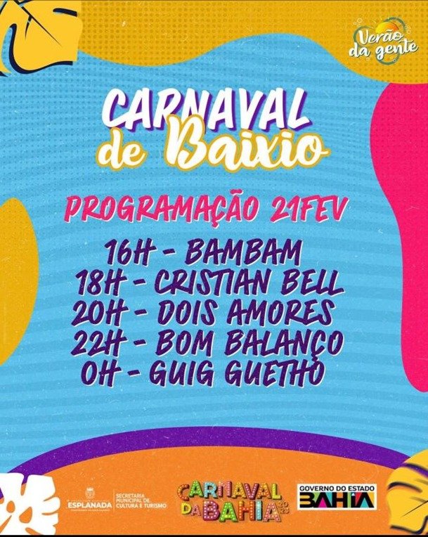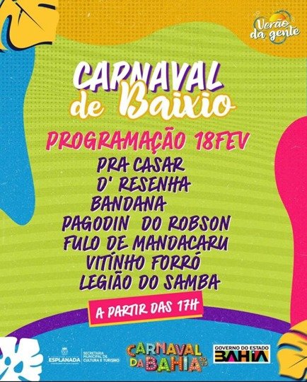 Entretenimento Prefeitura de Esplanada divulga grade de atrações do carnaval de Baixio 2023 By Portal do Recôncavo - 10 de fevereiro de 2023 0 131 Compartilhar no Facebook Tweet on Twitter Com 5 dias de festa e mais de 30 atrações, prefeitura divulga maior carnaval da região. Segue programação:
