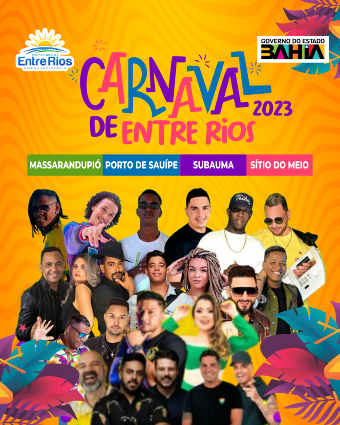 O Carnaval de Entre Rios será realizado entre os dias 17 e 21 de fevereiro, nas localidades de Subauma, Porto de Sauipe, Lagoa Redonda e Massarandupió, com diversas atividades e atrações para todos os públicos. A expectativa é que o evento atraia um grande público, movimentando a economia local e proporcionando momentos de diversão e descontração para moradores e turistas. O Governo do Estado da Bahia, apoiará os festejos carnavalescos de Entre Rios.