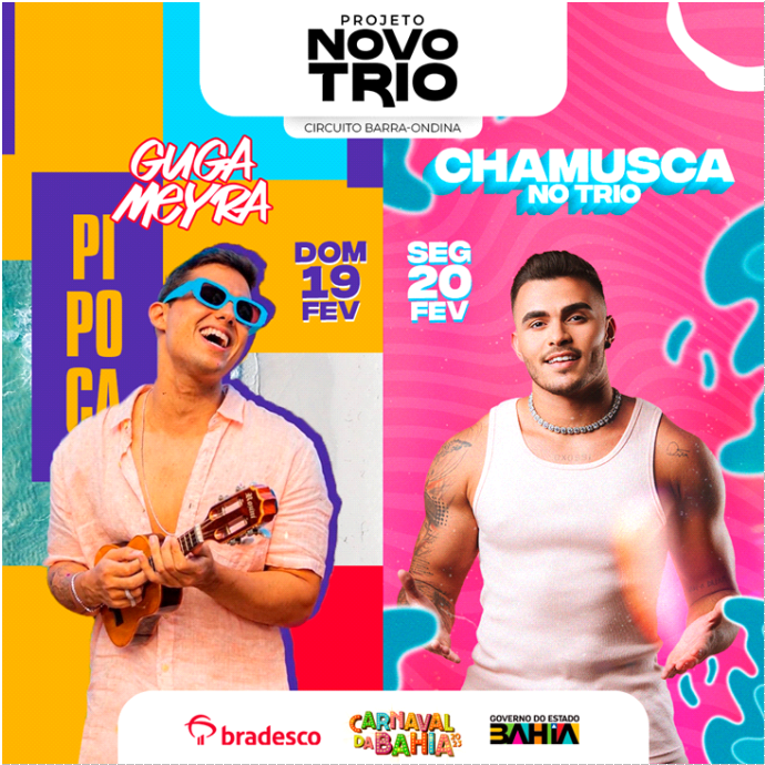 Projeto NOVO TRIO traz desfile de trio independente, nos dias 19 e 20 de fevereiro, no circuito Barra-Ondina, no carnaval de Salvador 2023, tendo como atrações os artistas GUGA MEYRA e o DJ PEDRO CHAMUSCA. Os artistas irão percorrer as ruas do circuito em cima de um trio elétrico, tocando para milhares de pessoas. As apresentações serão 100% gratuitas, não havendo nenhum tipo de comercialização do acesso do público.