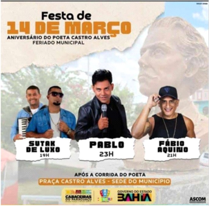 Em comemoração aos 167 anos de nascimento do poeta Castro Alves, o município de Cabaceiras do Paraguaçu, no Recôncavo, recebe a 13ª edição do Festival de Declamação de Poemas de Antônio de Castro Alves. O evento, que já é uma tradição na cidade e reúne gente de diversas regiões do estado, acontece no dia 14 de março.