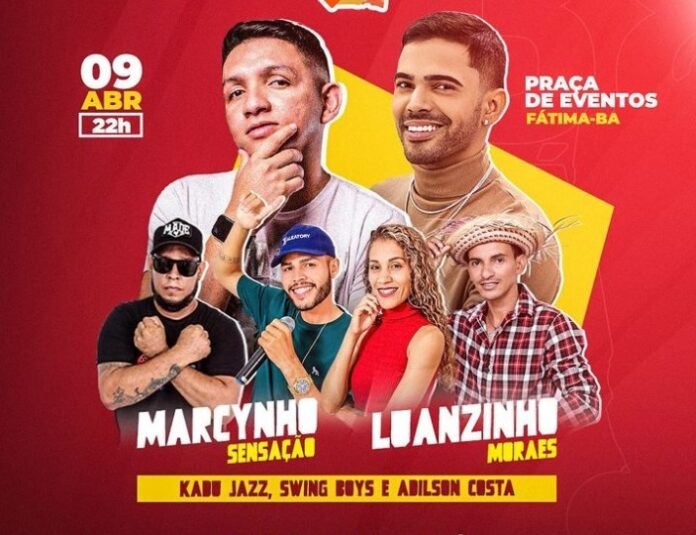 A Prefeitura de Fátima, cidade no Centro Norte da Bahia confirmou realização de grande evento no dia 09/04/2023. A festa será realizada na Praça de Eventos do município e contará com shows de Marcynho Sensação, Luanzinho Moraes, Kadu Jazz, Swing Boys e Adilson Costa.