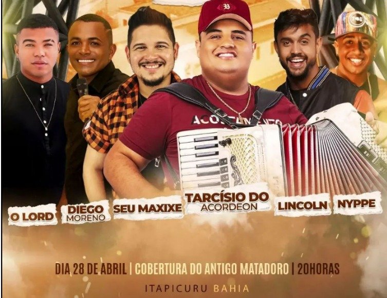 A Prefeitura de Itapicuru confirmou a realização de uma grande festa no próximo dia 28/04/23. O evento será realizado na Cobertura do Antigo Matadouro a partir das 21 horas. Já estão confirmados shows de Tarcísio do Acordeon, Seu Maxixe, Lincoln Sena, O Lord e Diego Moreno.
