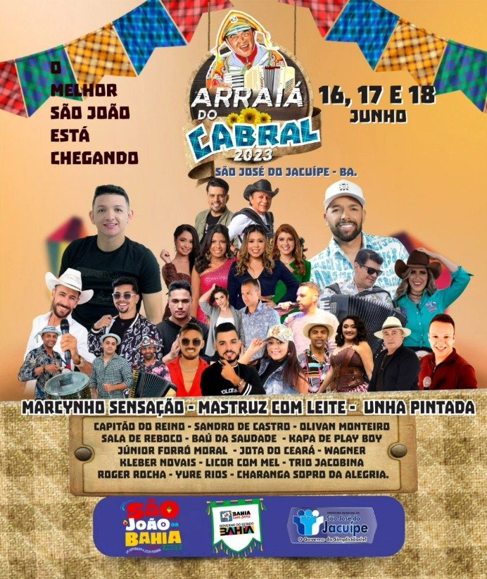 A Prefeitura de São José do Jacuípe confirmou as atrações do Arraiá do Cabral 2023, realizado na cidade de São José do Jacuípe entre os dias 18 e 18 de Junho. Confira as atrações já confirmadas: