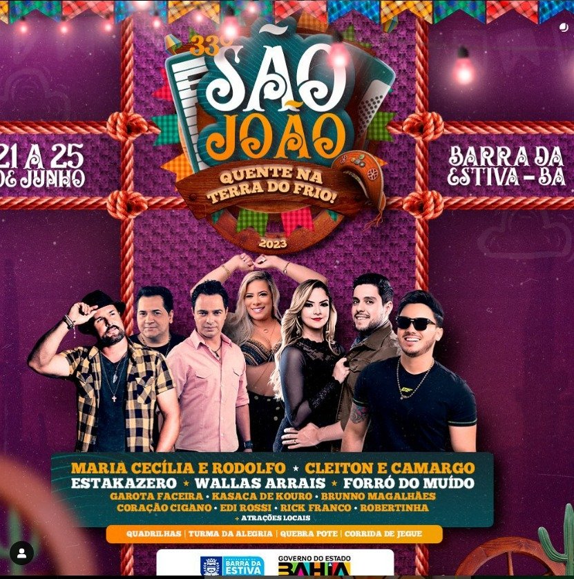 A Prefeitura de Barra da Estiva anunciou as atrações do São João Quente na Terra do Frio do São João 2023, como é denominado o evento ocorrerá entre os dias 21 e 25 de Junho e contará com as seguintes atrações: