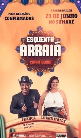 Foi divulgada a grade de atrações do Esquenta Arraiá Capim Guiné 2023, no povoado de Sumaré em Piritiba/BA! A noite de quarta-feira (21.06.23) vai abrir os trabalhos para o Arraiá do Capim Guiné e as grandes atrações vão subir ao palco antes do início oficial dos festejos! A noite fica por conta de Luana Matos, França, Alex Ouro, Brega e Vinho e Vira e Mexe. Não perca. Vem pro o Arraia Capim Guiné, “Olha pro céu meu amor”?