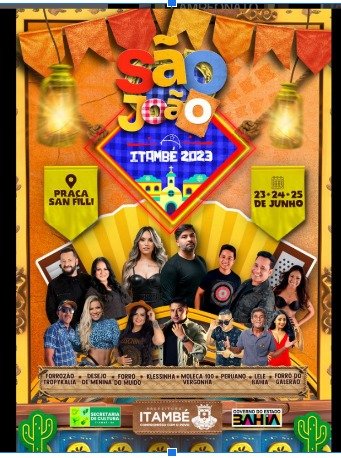 A Prefeitura de Itambé, cidade do sudoeste baiano, divulgou as atrações que farão parte dos festejos juninos de 2023 no município. A festa que terá duração de três dias, entre 23 e 25 de Junho voltou suas atenções para a música tradicional do período, uma grade formada majoritariamente por artistas de forró da várias vertentes. Confira as atrações: