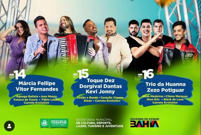 A Prefeitura de Itarantim anunciou as atrações que farão parte de um grande evento do Pré São João 2023 realizado no município. O evento que será realizado nos dias 14, 15 e 16 de Junho reunirá grandes atrações na Praça da Prefeitura. Confira as attrações: