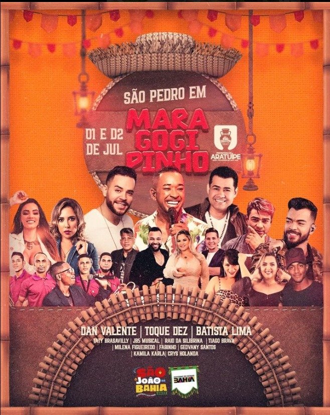 A Prefeitura de Aratuípe anunciou as atrações da Festa de São Pedro de Maraogipinho 2023, tradicional festa local do período junino que será realizada nos dias 01 e 02 de Julho. Estão programados shows de Toque Dez, Thiago Brava, JBS Musical, Kamyla Karla no dia 01 de Julho e no dia 02 de julho estão previstos shows de Alex e Camargo, Dan Valente, Raio da Silibrina e Batista Lima além de diversos artistas locais nos dois dias da festa que conta com o apoio institucional da Superintendência de Fomento ao Turismo, SUFOTUR.
