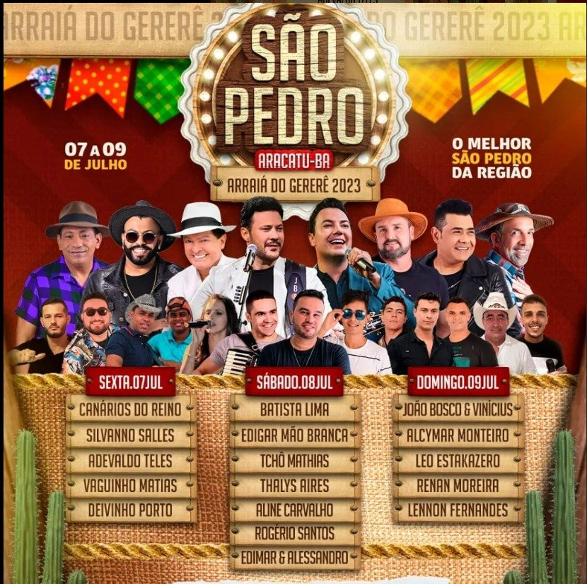 A Prefeitura Aracatu, cidade no sudoeste baiano revelou na última semana as atrações do Sâo Pedro do município. O Arraiá do Gererê 2023 será realizado entre os dias 07 e 09 de Julho e contará com umaa grande estrutura para receber shows dos mais variados estilos. Confira: