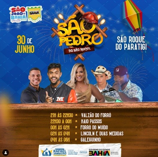 O São João acabou, mas as festas não param por ai, vem aí o São Pedro de São Roque, organizado pela Prefeitura de Rafael Jambeiro, com total apoio da Superintendência de fomento ao Turismo (SUFOTUR), Foram escolhidas oito atrações incríveis, sendo elas Valzão do Forró, Kaio Passos, Forró do Muído, Lincon e Duas Medidas e Galeguinho, que irão animar a noite de 30 de junho de 2023. Ney Alves, Sidney e Franciney, Machadinho irão finalizar o evento no dia 01 de Julho de 2023 esperamos por vocês com muita musicalidade.