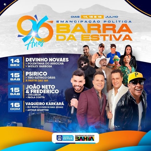 Por meio das redes sociais, a Prefeitura Municipal de Barra da Estiva, atualizou a grade de atrações que vão se apresentar nos festejos “Barra da Estiva 96 anos”. Grandes nomes da musica nacional, estadual e regional vão animar a população de Barra da Estiva e região. Nesta sexta-feira (14), a festa acontece a partir das 21 horas, com apresentações de Devinho Novais, Symone Morena, Pirilampo e Polentinha do Arrocha.