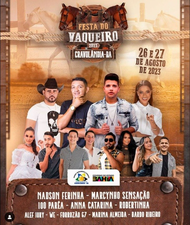Prefeitura Municipal de Cravolândia divulga as atrações da Festa do Vaqueiro 2023. A festa que é uma das mais tradicionais do Vale do Jiquiçá será realizada nos dias 26 e 27 de Agosto. Para animar o evento já estão confirmados shows de diversos artistas. Confira a programação: