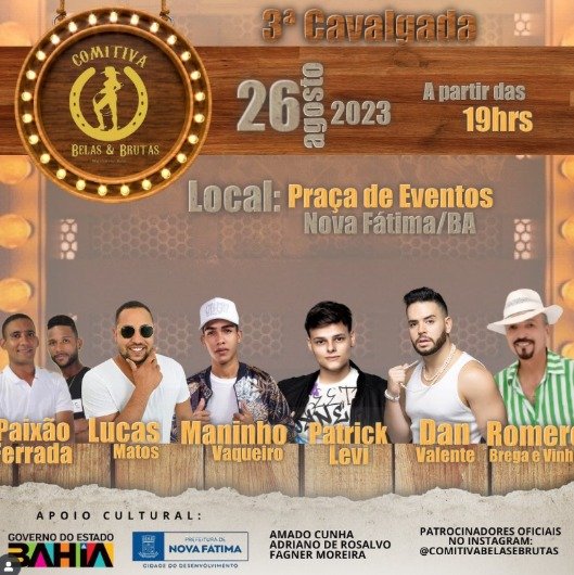 A cavalgada da Comitiva Belas & Brutas em Nova Fátima – BA acontecerá em 26 de agosto de 2023. A comitiva, que reúne mulheres em montarias, celebra a elegância e a rusticidade, e o evento de 2023 promete ser mais um grande encontro para compartilhar a tradição e a força feminina, formada por mulheres que participam de montarias, reunindo diferentes gerações e famílias para celebrar a cultura da cavalgada, a festa também irá contar com celebrações com shows musicais.